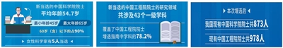 新当选的中国科学院院士平均年龄54.7岁,最小年龄45岁,最大年龄65岁,60岁(含)以下的占90%,女性科学家有5人当选。新当选的中国工程院院士的研究领域共涉及43个一级学科,覆盖了中国工程院院士增选指南中学科的78.2%。