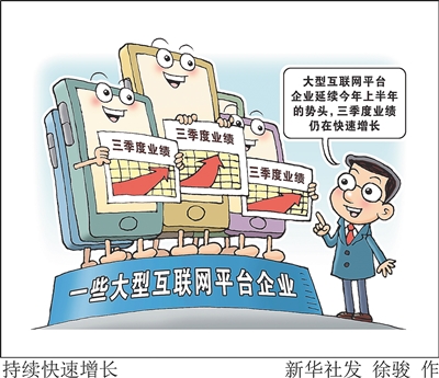 近期,一些大型互联网平台企业陆续披露三季度业绩。从已披露的财报看,互联网平台企业业绩继续保持快速增长,引起市场各方关注。在三季度,阿里巴巴营收同比增长9%,利润同比增长34%;京东集团经营利润93亿元,为历史新高;腾讯控股营收同比增长10%;百度净利润同比增长23%……大型互联网平台企业延续今年上半年的势头,三季度业绩仍在快速增长。