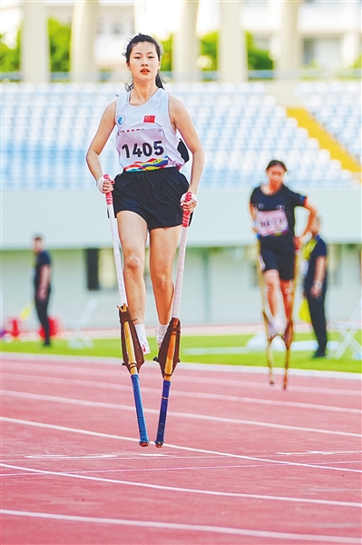 十一月二十六日,在三亚技师学院体育场,运动员参加省七届民族运动会高脚竞速比赛项目。
