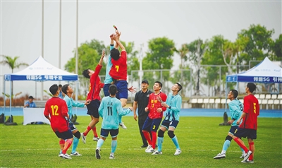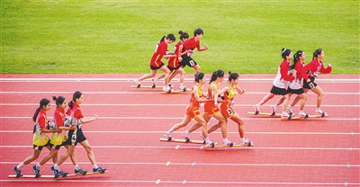 11月26日,在三亚技师学院体育场,参加省七届民族运动会板鞋竞速比赛项目的运动员齐心协力,赶超对手。