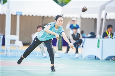 11月26日,在三亚技师学院篮球场,参加省七届民族运动会陀螺比赛项目的选手正在投掷陀螺。