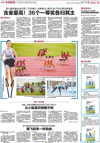 “看到很多观众在现场为我们加油打气,我们也更加有动力。我会继续加强练习,争取明年在第十二届全国少数民族传统体育运动会中能突破9米高度的目标。”刘家爱希望通过自己的努力让更多人知道和了解秋千项目。(本报三亚11月26日电)