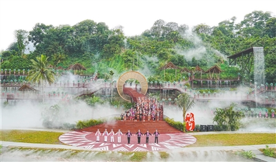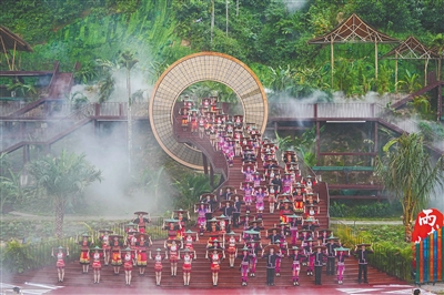 “咚、咚、咚……”11月25日下午,在沥沥细雨的陪衬下,小妹村传来阵阵锣声,几许清泉顺着雨林栈道倾泻而下,蒸腾的云雾缠绕着青山,宛若仙境。演员们手拉着手,踏着欢快的步伐,从山顶、水边、田园等四面八方走来,汇聚在舞台之上。