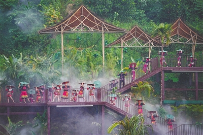老乡成为演员、演出团队提前驻扎到村里、演出队伍与村民同住同行、表演兼具艺术性和自然性的设计等,这些元素让“雨林·山水时光”实景演出浸润出在地化的别样魅力,吸引观众徜徉在“艺术+雨林”的诗和远方之中。