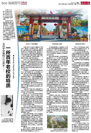 办学115年,文昌中学的发展并非一帆风顺。近日,海南日报记者来到该校采访,只见初冬的暖阳,洒在曾两任文中校长的詹行烍雕像上,一些前去参加活动的校友伫立雕像前,仔细阅读这位老校长的生平介绍。詹行烍为建校办学四处奔走的事迹,铭记于文中师生心中。
