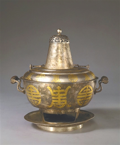 就目前保留的实物看,清宫火锅主要有三种。一种为锅中带炉,炉内烧炭,水烧开后,就可以把生鱼、生肉、蔬菜等放进去煮了。在某次故宫博物院举办的展览中,有一件慈禧太后使用过的“银寿字火锅”,该火锅做工讲究,造型完美,通体银质,由锅、盖、烟囱、闭火盖组成。闭火盖上雕有镂空“卐”字纹,锅体布满金银圆“寿”字、蝙蝠纹等,寓意福寿万年。