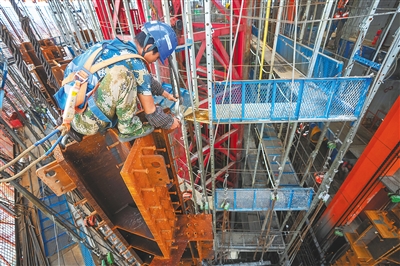 3. 11月2日,海南中心项目施工现场,工人加紧施工。当天,海南中心项目完成第15次顶升,项目建设高度达134.9米。