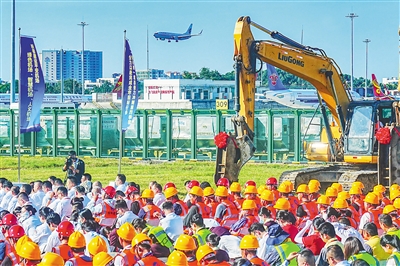 6. 11月20日,三亚凤凰机场三期改扩建项目正式开工,一架客机从开工仪式现场上空飞过。本报记者 王程龙 摄