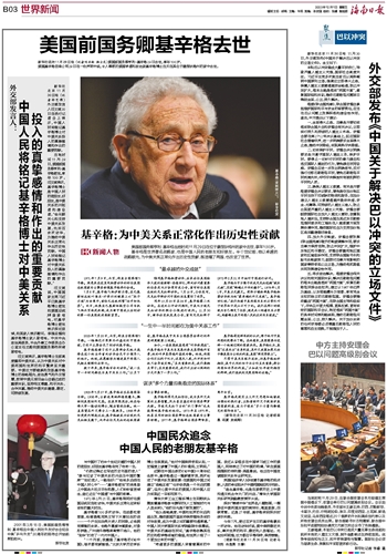 美国基辛格咨询公司29日在一份声明中说,令人尊敬的美国学者和政治家基辛格博士当天在其位于康涅狄格州的家中去世。