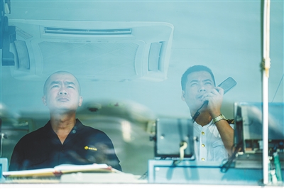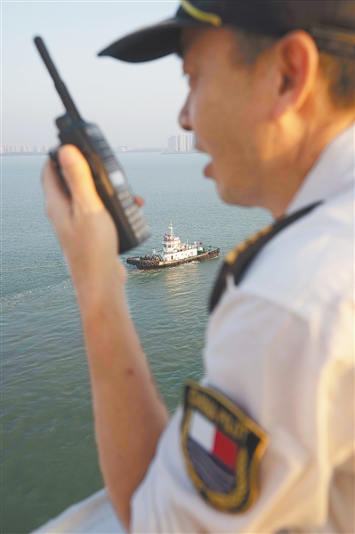 引航员在观察航道,用对讲机指挥拖轮。 王凯 摄