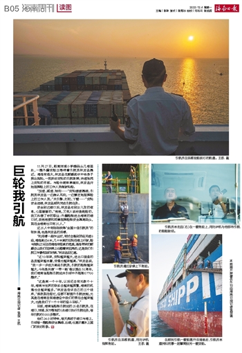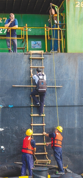 在顺利引航一艘船离开洋浦港后,引航员林道民和同事一起攀爬到另一艘货船。 本版图片除署名外均由海南日报记者袁琛摄