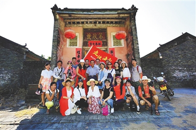 2016年7月16日,张雨和驴友们走读琼海市温泉镇石角村“资政第”后的合影。