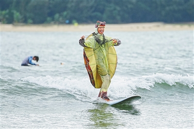 一名冲浪爱好者装扮成海龟,边冲浪边去掉渔网,传递海洋环保理念。