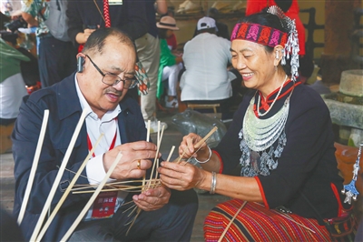 图③为外籍游客体验黎族编织技艺。