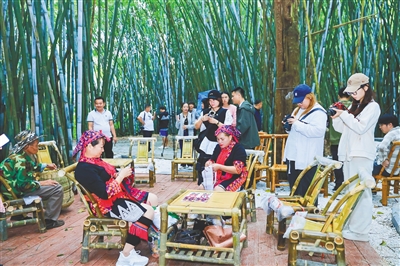 随后,采风团来到南坤镇美鹤园村。这是一个“户户居有竹”的古朴村落,满眼青翠竹影婆娑,宛如置身于百亩竹海听涛。近年来,美鹤园依托独有的竹林风貌,在打造以独具竹韵风格村居环境的同时,创办“竹林倩影”摄影基地,邀请文艺爱好者进村创作。