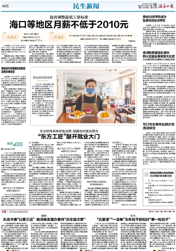本报海口12月6日讯 (记者易宗平)12月5日,省人社厅发布关于调整全省最低工资标准的通知,一、二类地区月薪分别不低于2010元、1850元。根据通知,我省一类地区月最低工资标准为2010元,每小时最低工资标准为17.90元,适用于海口市、三亚市、儋州市。二类地区月最低工资标准为1850元,每小时最低工资标准为16.30元,适用于三沙、文昌、琼海、万宁、东方、五指山、澄迈、乐东、临高、定安、屯昌、陵水、昌江、保亭、琼中、白沙等市县。