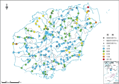 全省地表水水质总体良好,193个省控监测断面(点位)的水质优良(Ⅰ~Ⅲ类)比例为88.6%,同比下降5.2个百分点;劣Ⅴ类比例为0.5%,同比持平。19个市县中,文昌市和儋州市水质轻度污染,海口、东方、定安、万宁等4个市县水质良好,其余市县水质为优。