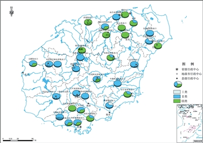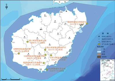 近岸海域水质和主要森林旅游区空气负离子水平示意图