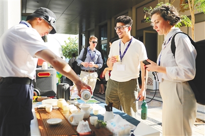 12月6日,在联合国气候变化迪拜大会中国角,参会者品尝中国茶。新华社记者 王东震 摄