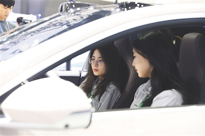 ⬆2023世界新能源汽车大会技术展开展,观众体验新能源汽车。
