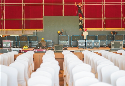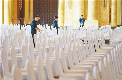 小图:展厅内,工作人员正在摆放座椅。 本组图片由本报记者 李天平 摄