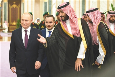 结束对阿联酋的访问后,普京前往沙特首都利雅得,与沙特王储兼首相穆罕默德·本·萨勒曼会谈。沙特通讯社报道,穆罕默德王储强调两国的历史性和牢固的关系,指出苏联是首个承认沙特的国家。