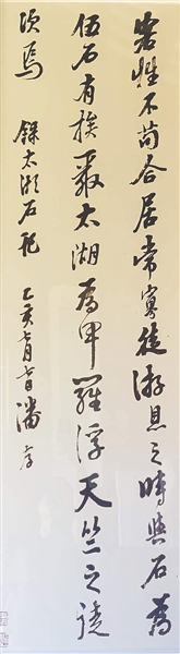 行书《节录白居易太湖石记》立轴,为潘存中年经意之作,气势连绵贯通,力透纸背、舒放自如,深得晚明诸大家精髓。作为碑帖融合的书法大家,他和岭南碑派书家李文田、邓承修等人一起,为清末岭南书坛的嬗变推波助澜,为碑派书法的中兴起到了承前启后的作用。