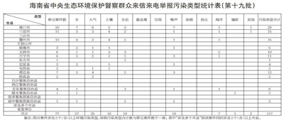 本报海口12月10日讯 (记者周晓梦)12月10日,中央第三生态环境保护督察组向我省转交第十九批环境信访交办件77件。目前累计已转交群众信访举报件1147件。第十九批77件群众信访举报件共涉及八种污染类型问题,其中水污染问题27件、大气污染问题25件、噪声污染问题19件、土壤污染问题18件、生态污染问题18件、海洋污染问题7件、其他污染问题2件和辐射污染问题1件。