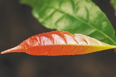 与枫香树叶的由绿转红不同,热带雨林的不少树种,新生长出来的叶片是红色的,后来又逐渐变成绿色,如五列木。五列木是五列木科五列木属常绿乔木或灌木植物,在海南热带雨林中极为常见。由于五列木的萼片5片、花瓣5片、雄蕊5片,就连它的雌蕊柱头顶端都是呈5裂的,所以便有了五列木这个名字。翻看《海南吊罗山野生植物彩色图鉴》一书,可以看到很多植物的嫩叶都是红色,如大花五桠果、大叶刺篱木、枇杷叶山龙眼、乌毛蕨……