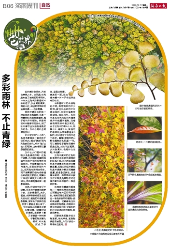 ■ 海南日报记者 李天平 通讯员 钟圆圆红叶满阶染浓秋,月夜生寒渐入冬。北风起,终究是吹进了海南的热带雨林,一片片三角状的枫香树叶纷纷落下,从金黄到橘黄,再到火红,构成热带雨林的经典色调——五彩斑斓。