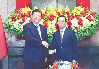 新华社河内12月13日电(记者孙浩 刘锴)当地时间12月13日上午,中共中央总书记、国家主席习近平在河内主席府同越南国家主席武文赏举行会谈。习近平指出,昨天,我同阮富仲总书记宣布构建具有战略意义的中越命运共同体,携手开辟了两党两国关系发展新阶段。中越两国人民在争取国家独立和民族解放斗争中并肩战斗,在社会主义革命和建设事业中相互支持,始终守望相助、风雨同舟,结下了“同志加兄弟”情谊。构建具有战略意义的中越命运共同体,是对两党两国老一辈领导人共同意志的传承,对往昔峥嵘岁月的致敬,对两国革命友谊的发扬,是两党两国高层从中越关系长远发展大局和世界社会主义力量团结的战略全局出发作出的重大历史性决策,符合中越推进各自现代化事业的共同需要,符合两国人民的共同利益。