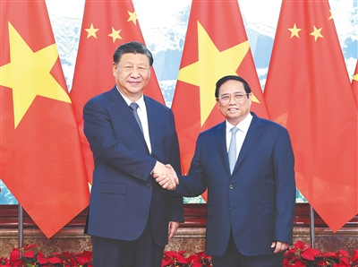 当地时间12月13日上午,国家主席习近平在河内政府驻地会见越南总理范明政。 新华社记者 庞兴雷 摄