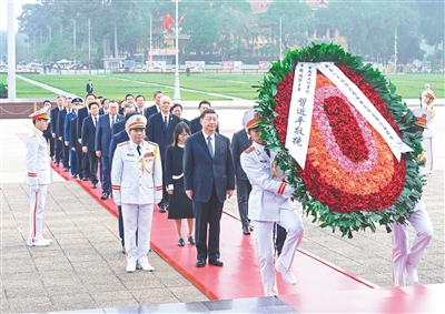 当地时间十二月十三日上午,中共中央总书记、国家主席习近平在河内瞻仰胡志明陵并敬献花圈。新华社记者 申宏 摄