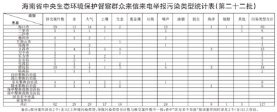 本报海口12月13日讯(记者周晓梦)12月13日,中央第三生态环境保护督察组向我省转交第二十二批环境信访交办件82件。目前累计已转交群众信访举报件1343件。第二十二批82件群众信访举报件共涉及8种污染类型问题,其中水污染问题29件、大气污染问题29件、噪声污染问题24件、土壤污染问题17件、生态污染问题16件、海洋污染问题8件、其他污染问题3件、辐射污染问题1件。