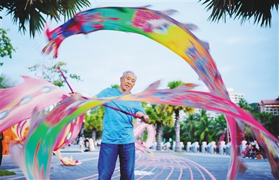 近日,在三亚鹿回头滨河公园,不少健身爱好者正在舞动手中的“彩带龙”。