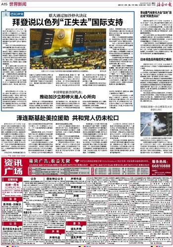 新华社北京12月13日电 (王逸君)联合国大会12日以153个国家支持、10个国家反对、23个国家弃权的表决结果通过关于在加沙地带实现人道主义停火的决议。美国总统约瑟夫·拜登当天说,以色列因“无差别轰炸”加沙地带“正失去”国际社会支持。同时,关于本轮冲突结束后加沙地带治理问题,美以的分歧正在凸显。