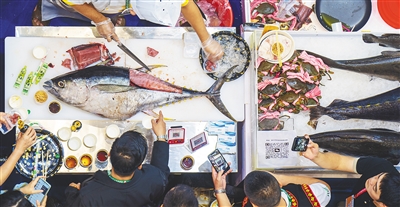 ① 冬交会陵水馆,新鲜海产品吸引参展观众品尝。