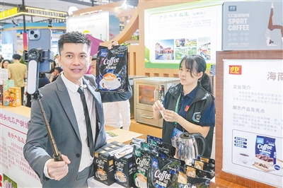 ② 冬交会澄迈馆,主播向网友展示咖啡产品。