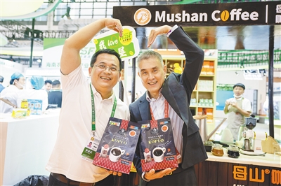 新加坡参展商(右)和母山咖啡工作人员比心。