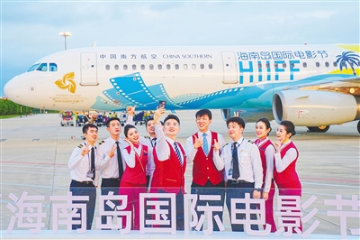 12月15日,“海南岛国际电影节号”彩绘飞机成功首航,执行CZ6899武汉天河—三亚凤凰航班,并在航班上举办相关特色主题航班活动。据了解,“海南岛国际电影节号”是海南省第一架以艺术活动冠名的专机。图为乘务组工作人员在“海南岛国际电影节号”前自拍合影留念。