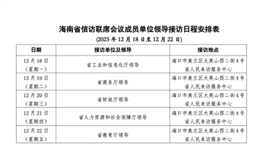 根据安排,12月18日至22日,省工业和信息化厅、省商务厅、省财政厅、省人力资源和社会保障厅、省教育厅相关负责人将分别于海南省海口市美兰区大英山西二街4号“海南省人民来访服务中心”接访群众。
