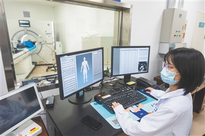 在瑞金海南医院,医务人员使用CT为患者检查身体。