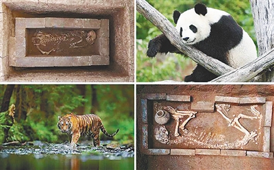 陕西西安霸陵动物殉葬坑出土的大熊猫骨骼(左上)、老虎骨骼(右下)与大熊猫、老虎对比图。 图片来源:陕西省考古研究院