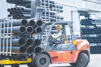 日前,定安塔岭工业园内,海南联塑科技实业有限公司工人驾驶叉车,运送管材管件。据悉,该企业正加紧生产PVC排水管及配件等产品,主要应用于民用建筑、市政排水、电力通信等领域。文/图 见习记者 林芷羽 本报记者 袁琛
