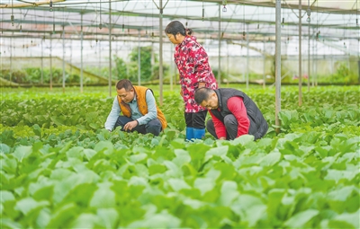 12月19日,在屯昌县坡心镇高朗洋蔬菜基地,县农业技术和机械化事务中心的工作人员在查看蔬菜长势,科普防寒措施,帮助菜农(左二)科学应对寒冷天气。