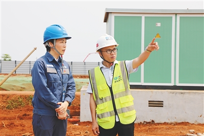 南方电网海南电网公司客户经理(左一)到海南医学院桂林洋校区一期项目施工现场走访,主动靠前服务。