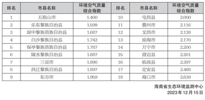按照《环境空气质量标准》(GB3095-2012)及修改单、《环境空气质量评价技术规范(试行)》(HJ663-2013)和《城市环境空气质量排名技术规定》(环办监测〔2018〕19号)评价,2023年11月,全省环境空气质量优良天数比例为98.1%,其中优级天数比例为69.3%,良级天数比例为28.8%,轻度污染天数比例为1.9%,无中度及以上污染天。环境空气质量排名靠前的市县分别是五指山市、乐东黎族自治县和琼中黎族苗族自治县,排名靠后的市县分别是海口市、定安县和临高县。2023年11月全省18个市县环境空气质量排名如右: