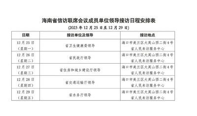 根据安排,12月25日至29日,省卫生健康委员会、省民政厅、省住房和城乡建设厅、省交通运输厅、省水务厅相关负责人将分别于海南省海口市美兰区大英山西二街4号“海南省人民来访服务中心”接访群众。