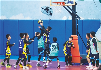 12月23日,在琼海市体育馆举办的2023年“NYBO”青少年篮球公开赛上,小球员们在全力攻防。