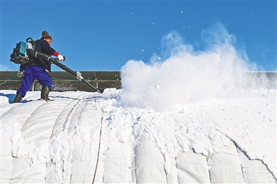 日前,农民在山东省烟台市福山区门楼街道用鼓风机清理暖棚上的积雪。 新华社发